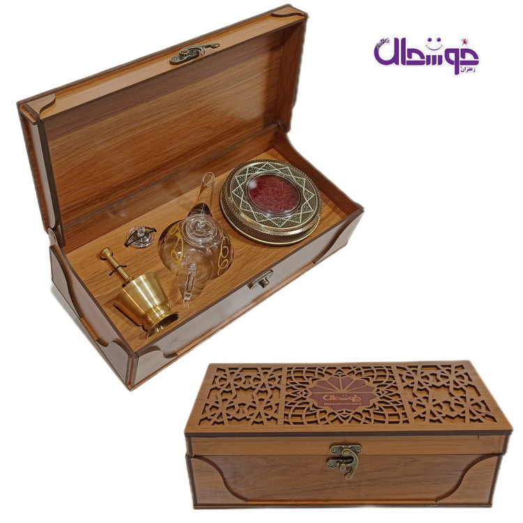 پک کادویی زعفران (زعفران سرگل اعلاء یک مثقال با جعبه چوبی رنگ گردویی + قوری + هاون نقلی)